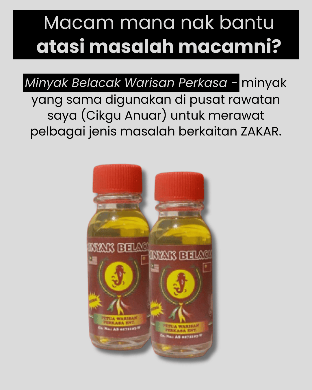 Bermula dari arwah tokwan cikgu sebagai tukang urut batin…Alhamdulillah diwarisi oleh saya sendiri (Cikgu Anuar) hingga ke harini!